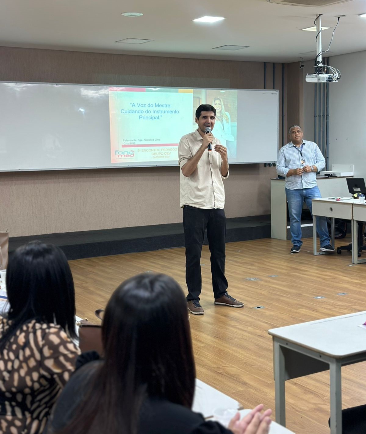 Com o tema “A Voz do Mestre: Cuidando do Instrumento Principal”, o momento foi conduzido pela fonoaudióloga Alanalice da Silva Lima, que trouxe uma reflexão sobre a voz como ferramenta essencial para os profissionais no dia a dia.
