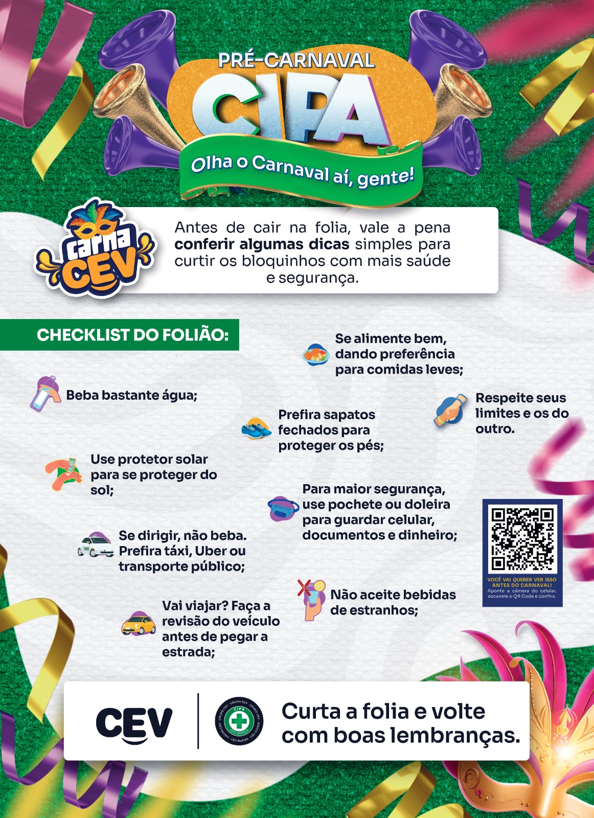 Cartazes informativos também foram fixados em pontos estratégicos, fortalecendo ainda mais a cultura de prevenção. Unindo informação, criatividade e alegria, as CIPA’s mostraram como aproveitar o carnaval com responsabilidade, saúde e segurança.