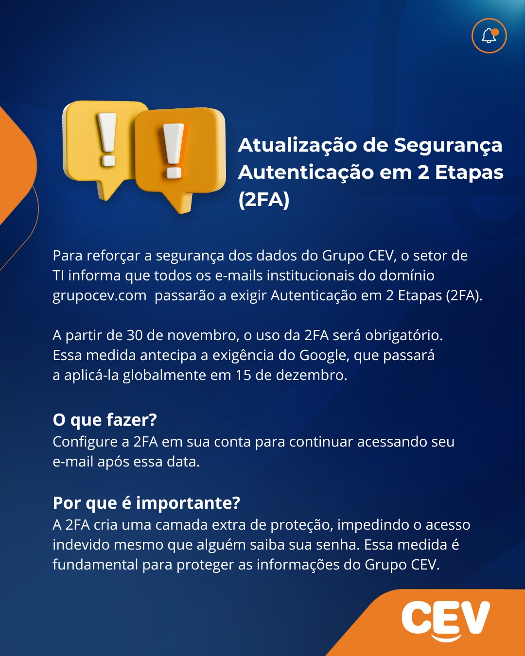 A ativação da Autenticação em 2 Etapas (2FA) deve ser feita por cada colaborador.