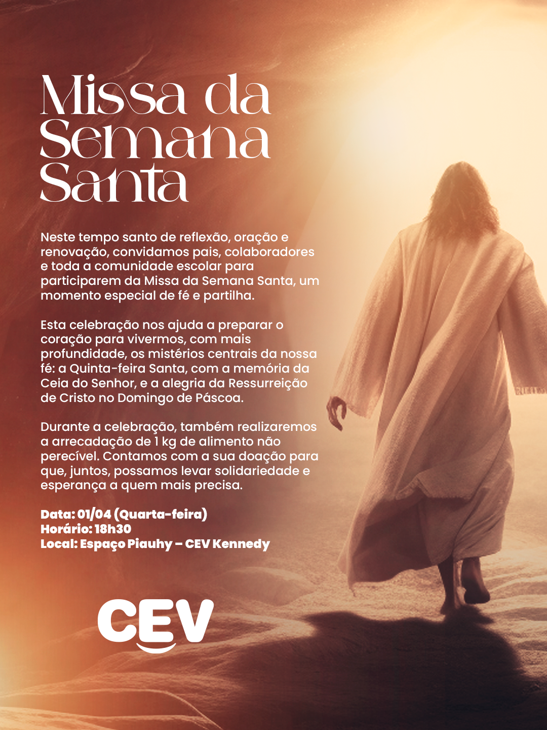 Convidamos colaboradores, pais e responsáveis para vivermos juntos a Missa da Semana Santa. Um encontro de fé e partilha para toda a nossa comunidade escolar, neste tempo tão significativo.